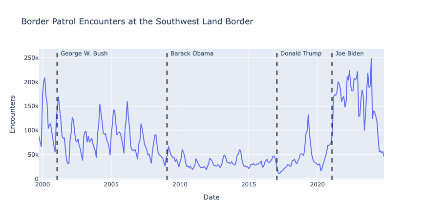 I wrote a blog post exploring this in more detail: Visualizing 25 Years of Border Patrol Data with Python. Here's the key graphic from the post, showing monthly encounters at the Southwest border across four administrations: